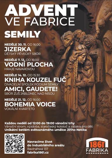 Každou adventní neděli ožije nádvoří industriálního areálu FABRIKA 1861 vánoční atmosférou. Od 12.00 do 19.00 budou pro návštěvníky připraveny řemeslné a dárkové stánky, hudba, občerstvení, vánoční strom, staročeský kolotoč i program pro děti. Součástí bude také výjimečná možnost zhlédnout unikátní betlém světoznámého umělce Jiřího Netíka.