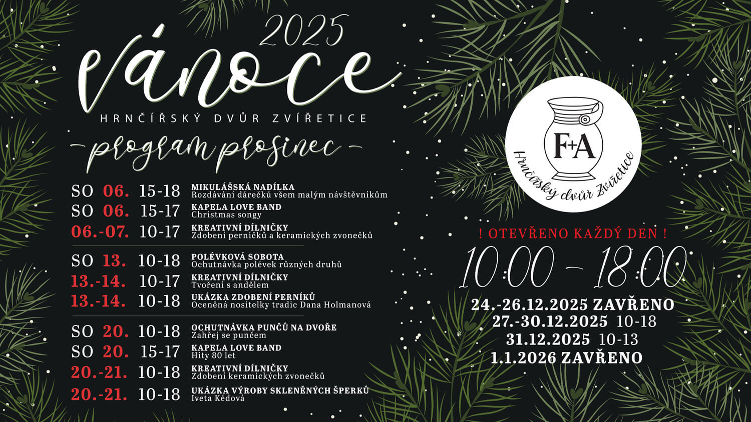 Areál zůstává po celý prosinec otevřen denně od 10.00 do 18.00. Výjimkou jsou vánoční svátky, kdy bude provoz upraven. Podrobný program i informace o otevírací době naleznete na webu Hrnčířského dvora Zvířetice.