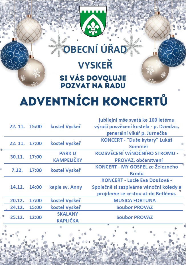 Obec Vyskeř zve všechny milovníky hudby a vánoční atmosféry na řadu adventních koncertů, které se uskuteční v Kostele Nanebevzetí Panny Marie, v kapli sv. Anny a také v parku u Kampeličky.