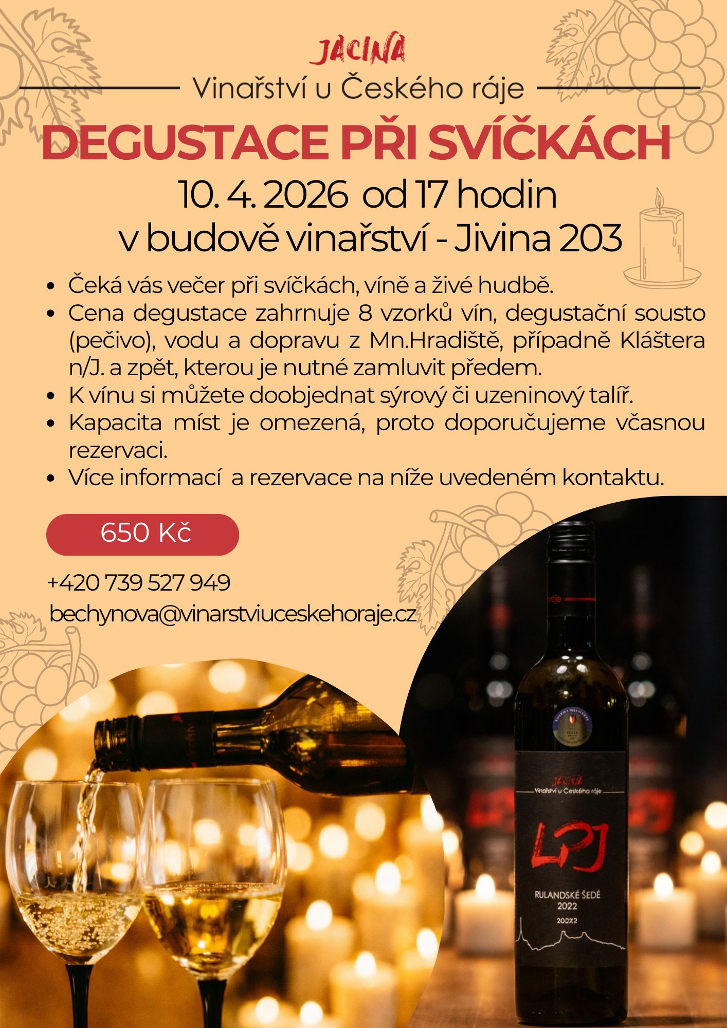 Vychutnejte si jedinečný večer ve vinařství na Jivině, kde se víno snoubí s atmosférou svíček a živé hudby. Vinařství u Českého ráje zve na jarní degustaci, která nabídne nejen výběr vín, ale i příjemné posezení v autentickém prostředí vinařské budovy.