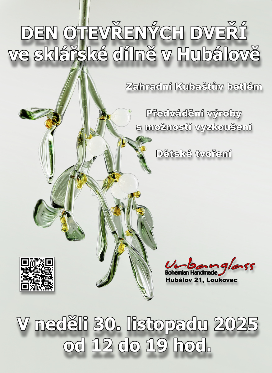 Sklárna Urbanglass v Hubálově Vás zve na zahájení adventní sezóny. O první adventní neděli 30. listopadu 2025 otevře sklárna opět dveře pro všechny, kdo by rádi nakoukli pod ruce sklářů nebo si i sami zkusili vyrobit maličkost pro radost či si jen rádi osahali sklářské řemeslo.