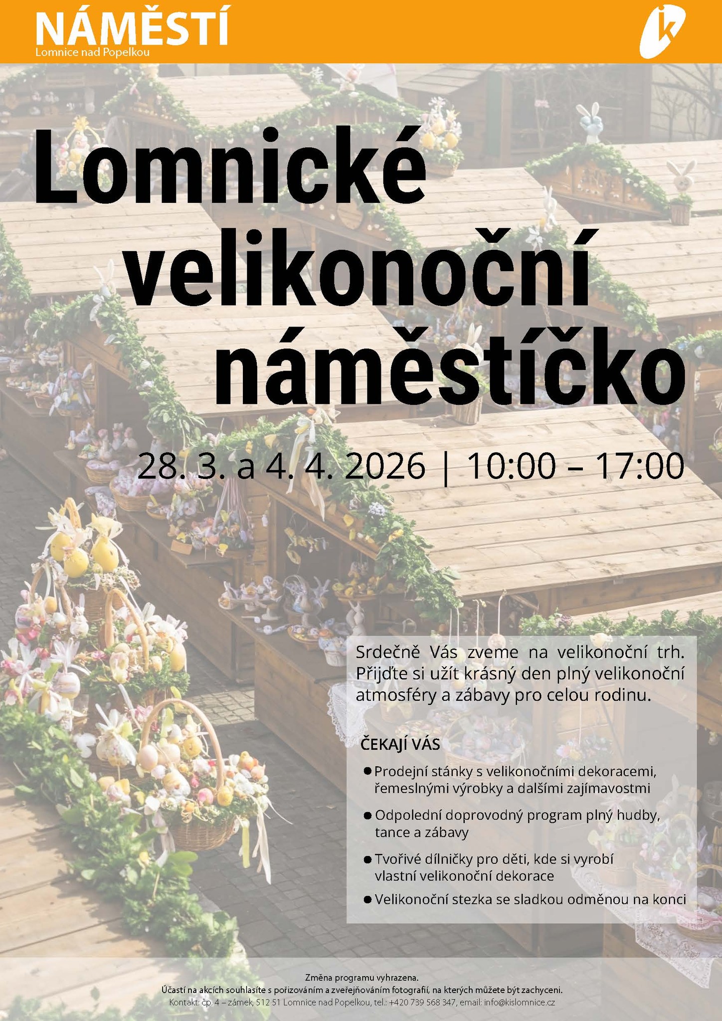 V sobotu 28. března 2026 ožije náměstí v Lomnici nad Popelkou velikonoční atmosférou. V čase od 10.00 do 17.00 hodin se zde uskuteční Lomnické velikonoční náměstíčko, které nabídne pestrý program pro celou rodinu.