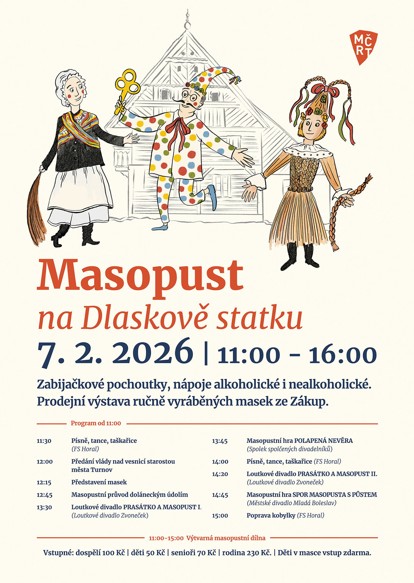 Tradiční masopustní veselice s vystoupením folklórních a loutkařských souborů. Připravena je masopustní výtvarná dílna nejen pro děti a samozřejmě zabíjačkové pochoutky, nápoje alkoholické i nealkoholické.
