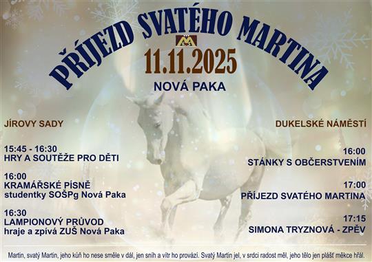 V úterý 11. listopadu 2025 dorazí do Nové Paky svatý Martin se svým bílým koněm, aby přinesl do města tradiční svatomartinskou atmosféru. Program začne v Jírových sadech, kde budou od 15:45 připraveny hry a soutěže pro děti. V 16:00 zazní kramářské písně v podání studentů SOŠPg Nová Paka a poté se účastníci vydají lampionovým průvodem, který v 16:30 doprovodí hudebníci ze ZUŠ Nová Paka.