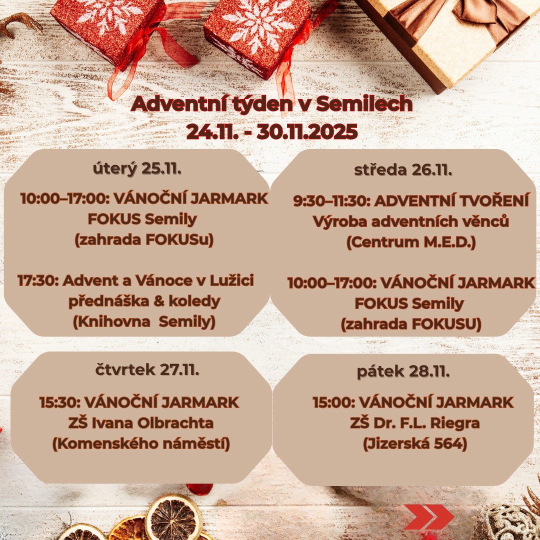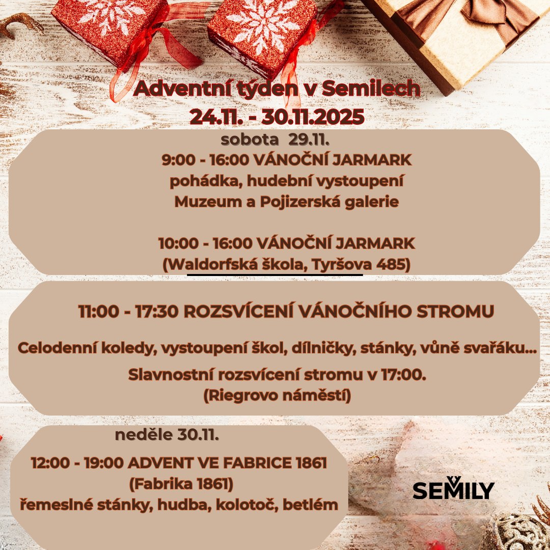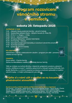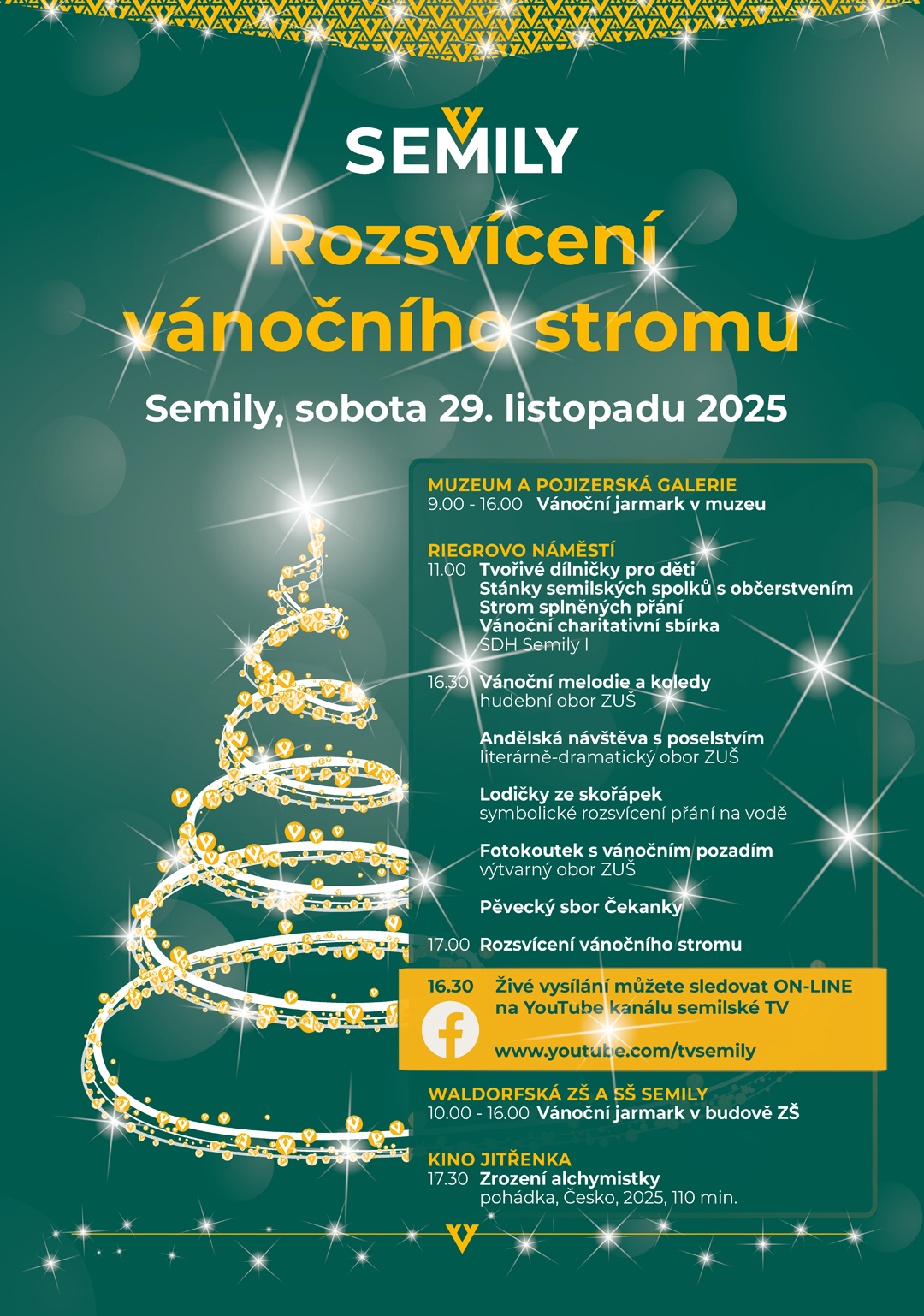 Město Semily zve na tradiční slavnostní rozsvícení vánočního stromu, které se uskuteční v sobotu 29. listopadu na Riegrově náměstí. Během odpoledne a podvečera se můžete těšit na vystoupení místních škol, pěveckých souborů i dětských kapel. Program doplní adventní tržiště a doprovodné aktivity pro děti.
