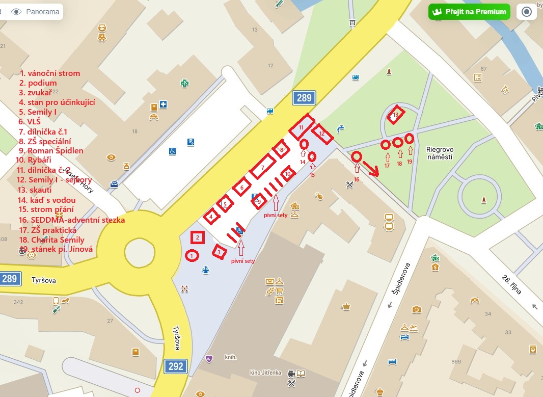 Na Riegrově náměstí najdete stánky s vánočním zbožím a občerstvením. Otevřené budou také vybrané provozy ve přilehlém prostoru, například knihovna a základní škola. Připraveny jsou výtvarné aktivity pro veřejnost, aktuální výstavy a drobné rukodělné dílničky. Součástí trhu je i malé kovotepectví s možností vytvořit si jednoduchý šperk. V prodeji budou také produkty z tradic regionu – tradiční semilské vánočky a cukroví.