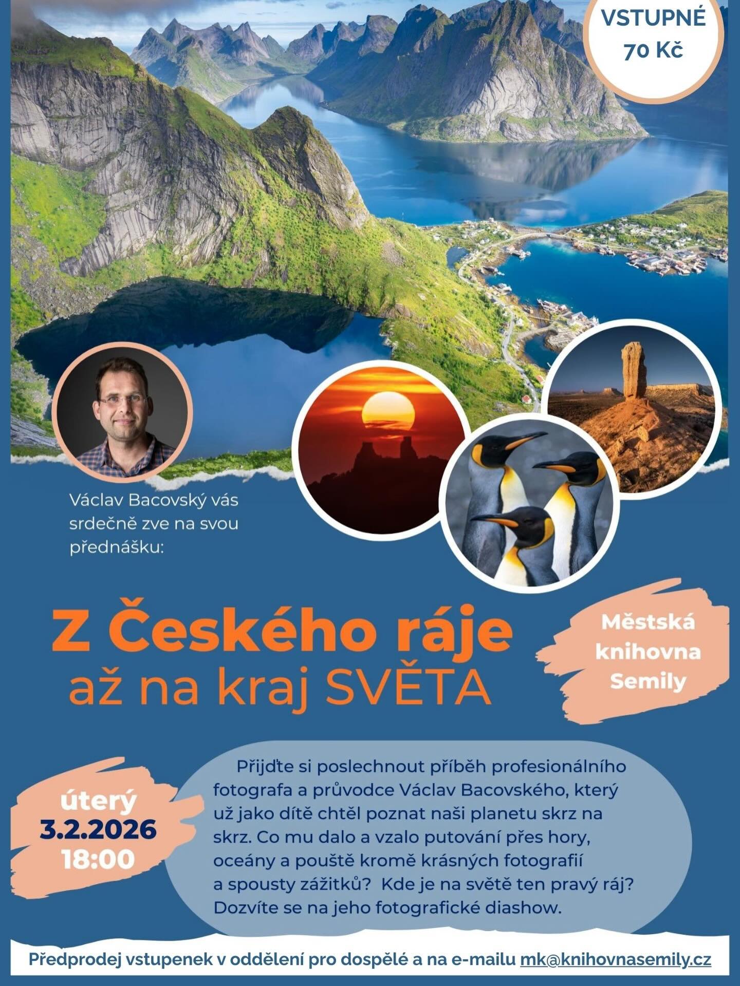 Ze zapadlé vesnice poblíž Sobotky až na konec světa - tak by se dal shrnout příběh fotografa a cestovatele Václava Bacovského, který už jako dítě chtěl poznat naši planetu skrz na skrz. Co mu dalo a vzalo putování přes hory, oceány a pouště kromě spousty fotografií i nezapomenutelných zážitků? Jak se proměnilo jeho vnímání domova? Kde na světě je ten pravý ráj? Dozvíte se na jeho fotografické diashow v čítárně knihovny v Semilech. Vstupné 70 Kč, předprodej možný v oddělení pro dospělé nebo na emailu mk@knihovnasemily.cz.