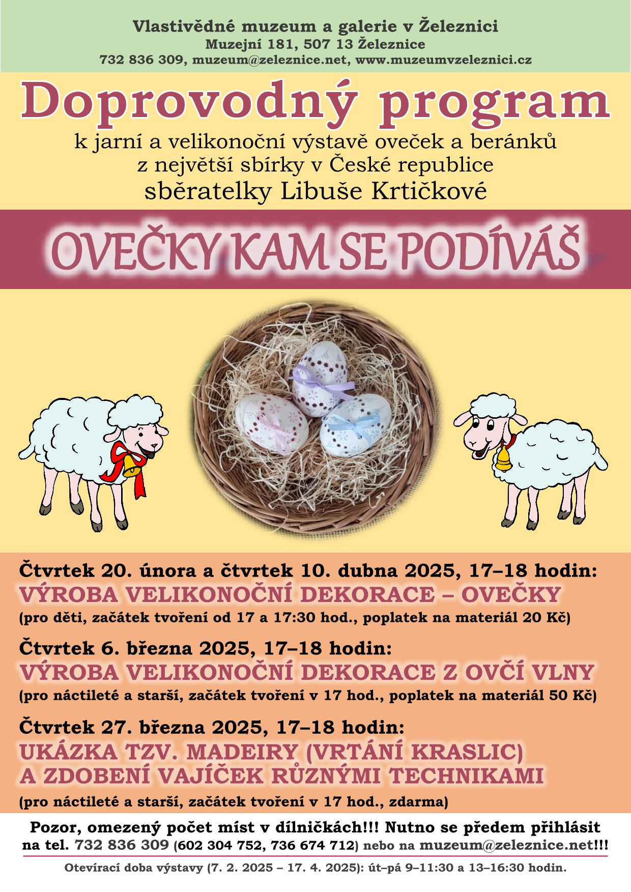 Čtvrtek 20. února a 10. dubna 2025 (17–18 h) – Výroba velikonoční dekorace – ovečky (pro děti, poplatek 20 Kč, začátky tvoření v 17:00 a 17:30).