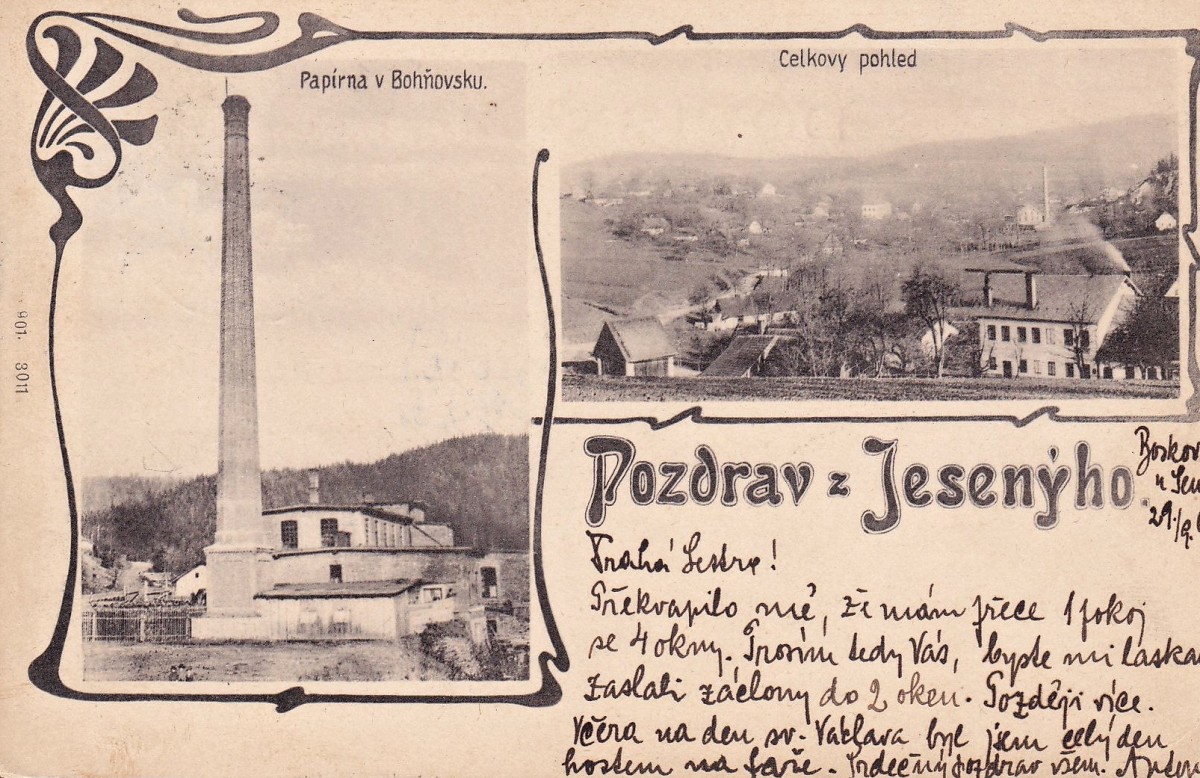 W 1902 roku w miejscowości Jesenný rozpoczęła działalność huta szkła Josefa Bachtíka, specjalizująca się w wytwarzaniu szklanych prętów. Huty stopniowo zatrudniały nawet do 70 pracowników, a roczna produkcja zbliżała się do 600 ton masy szklanej. Jednak druga wojna światowa zakończyła pomyślny rozwój huty szkła. Hutę zamknięto, a na jej miejscu w 1954 roku powstały warsztaty naprawy ciągników.