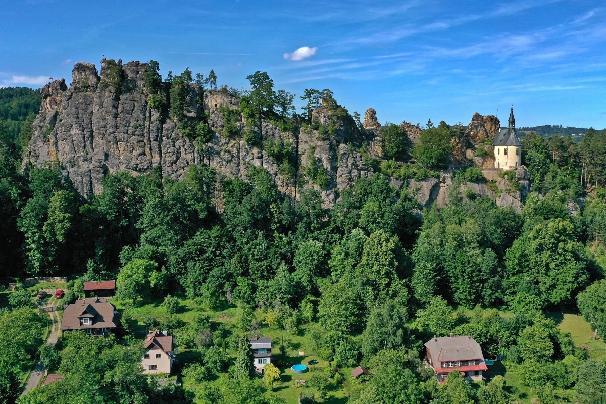 The nearby Suché skály and Vranovský hřeben are formed of 100-million-year-old sandstones, whose layers were tilted to an almost vertical position during orogenic processes. Suché skály, designated a national natural monument, together with the Vranovský hřeben and the Jizera River, form a truly unique Tertiary geological feature.