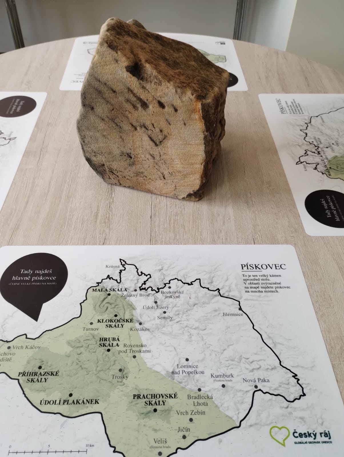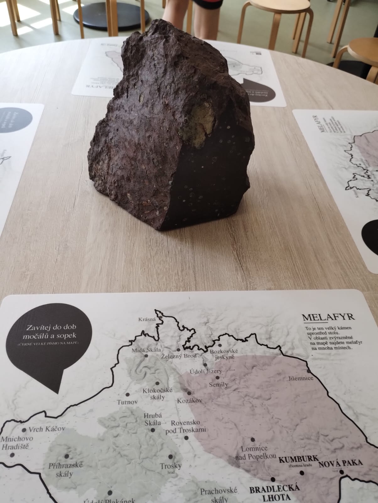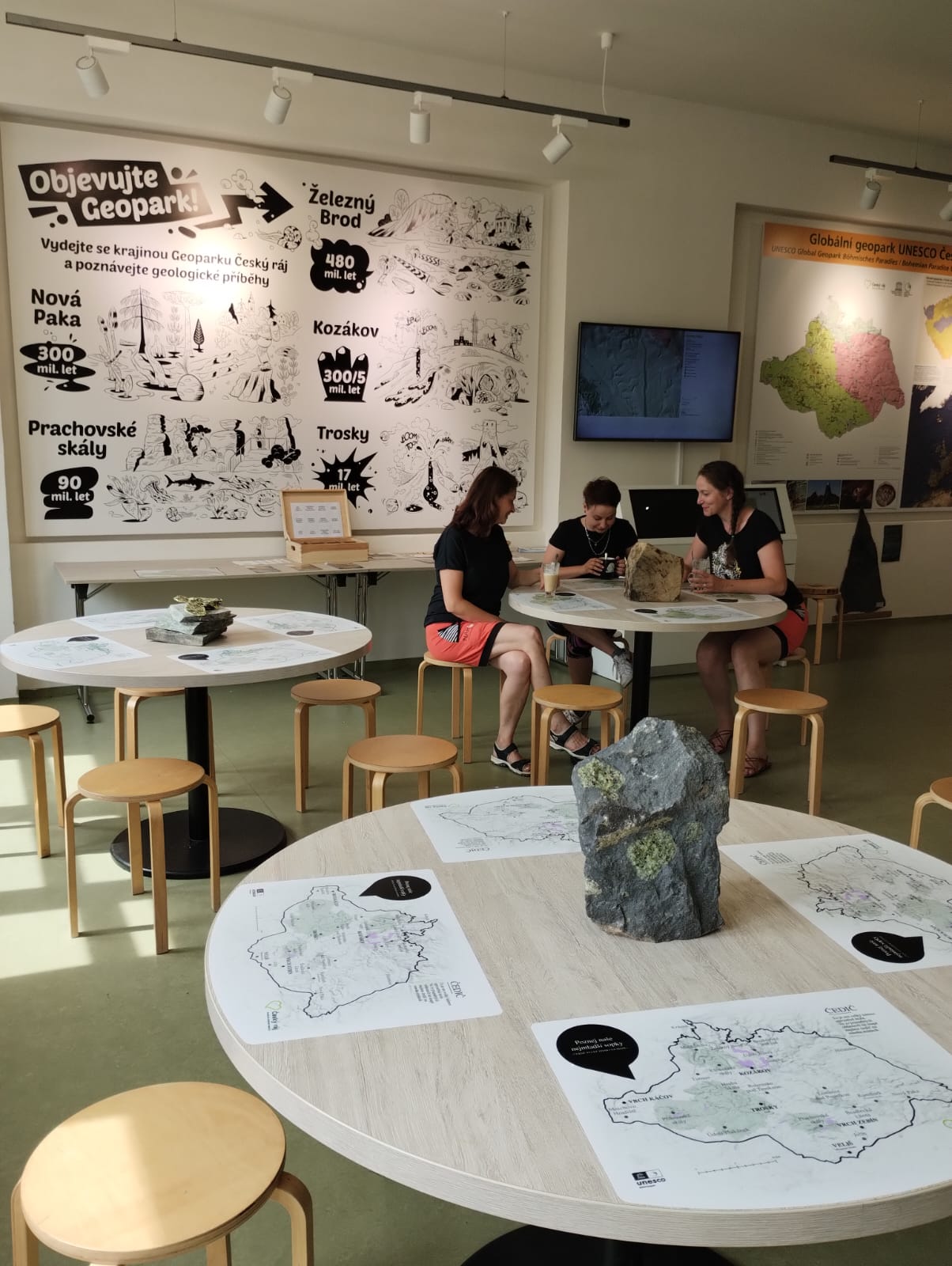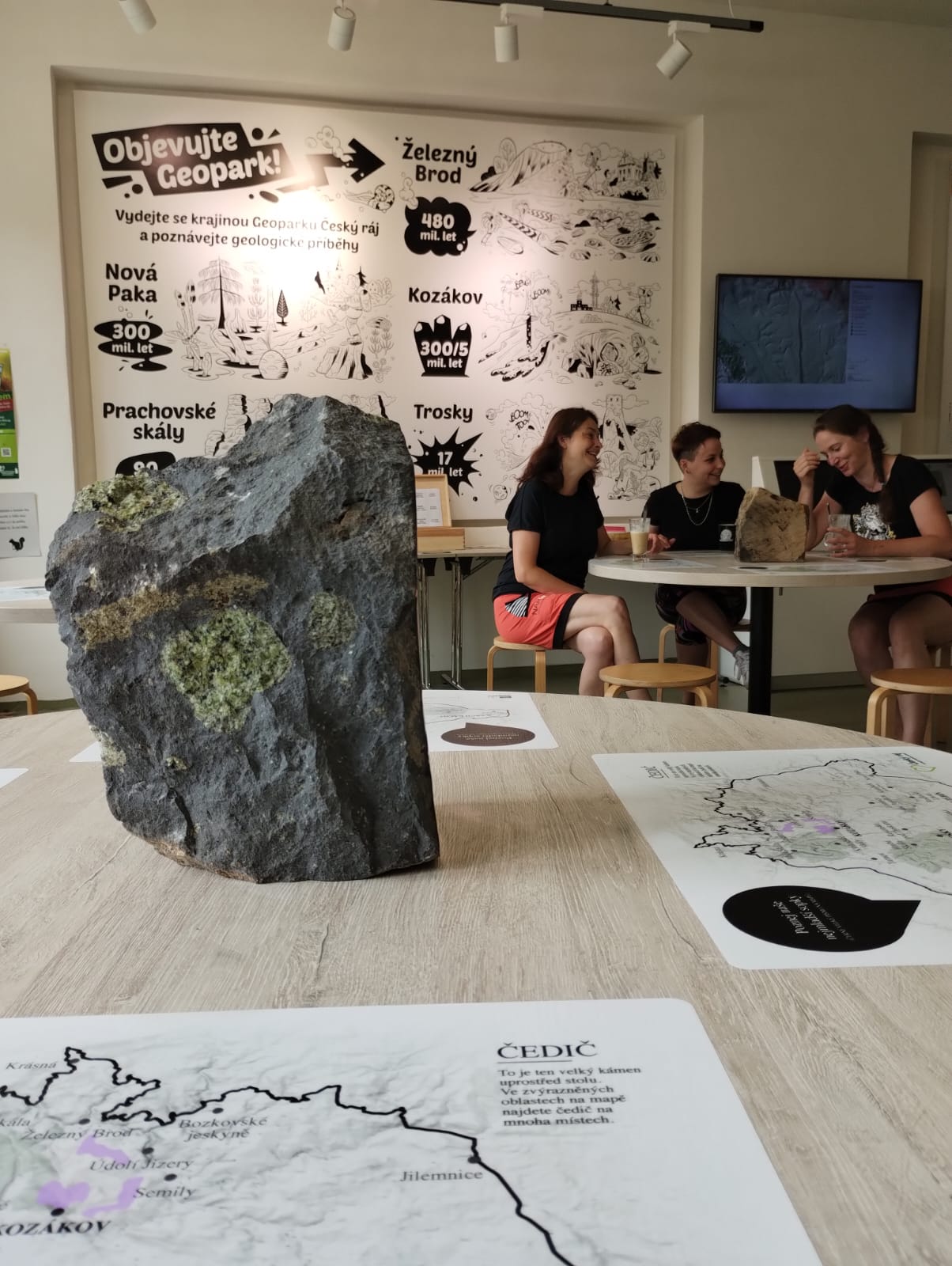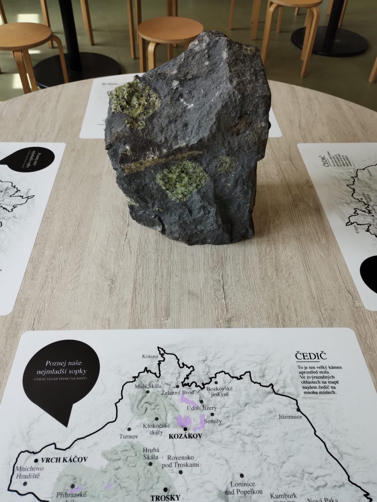 Na každém stole zde najdete částečně opracovaný vzorek horniny typické pro Český ráj (pískovec, fylit, melafyr, čedič) a nalepené mapy Geoparku Český ráj uzpůsobené jako prostírání s informacemi o jedné konkrétní hornině umístěné uprostřed stolu s vyznačením jejího výskytu v geoparku.