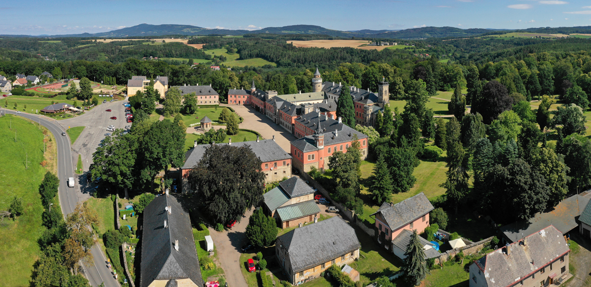 Znajdujemy się na pograniczu regionu Podještědí i Czeskiego Raju, na końcu czterorzędowej alei lipowej Rohanka, założonej w 1850 roku i prowadzącej od wschodniej bramy parku pałacowego Sychrov w stronę kościoła w miejscowości Jenišovice.