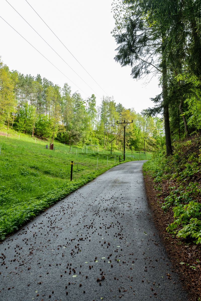 Po dešti se mohou vyskytovat kaluže a bláto, následuje travnatá cesta a mírné klesání po kamenitém úseku (kritické místo). Poté přichází prudké klesání po asfaltové silničce (kritické místo), které vás dovede zpět na výchozí parkoviště.