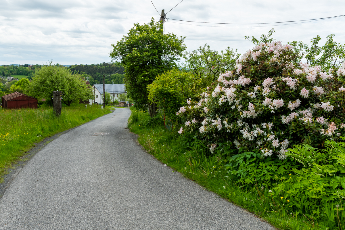 Pokračujete rovinou a poté středně náročným stoupáním osadou Horky. Odbočíte ke koupališti a po modré pěší značce dorazíte k rozcestí U Voděrad. Odtud trasa vede po asfaltu přes Záborčí k hlavní silnici Malá Skála – Turnov (pozor na provoz). Po 400 m odbočíte vlevo na kamenitou lesní cestu se stoupáním.