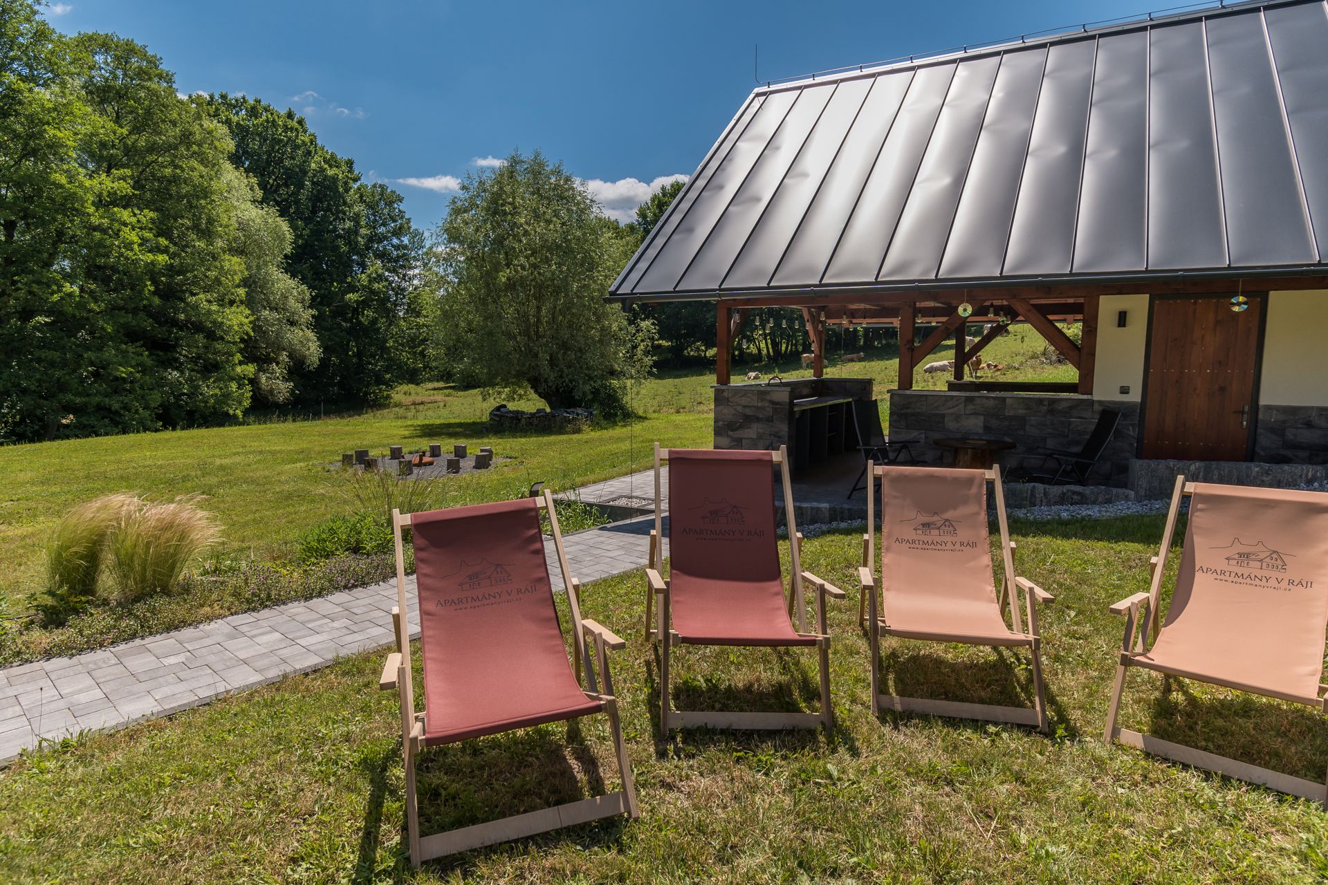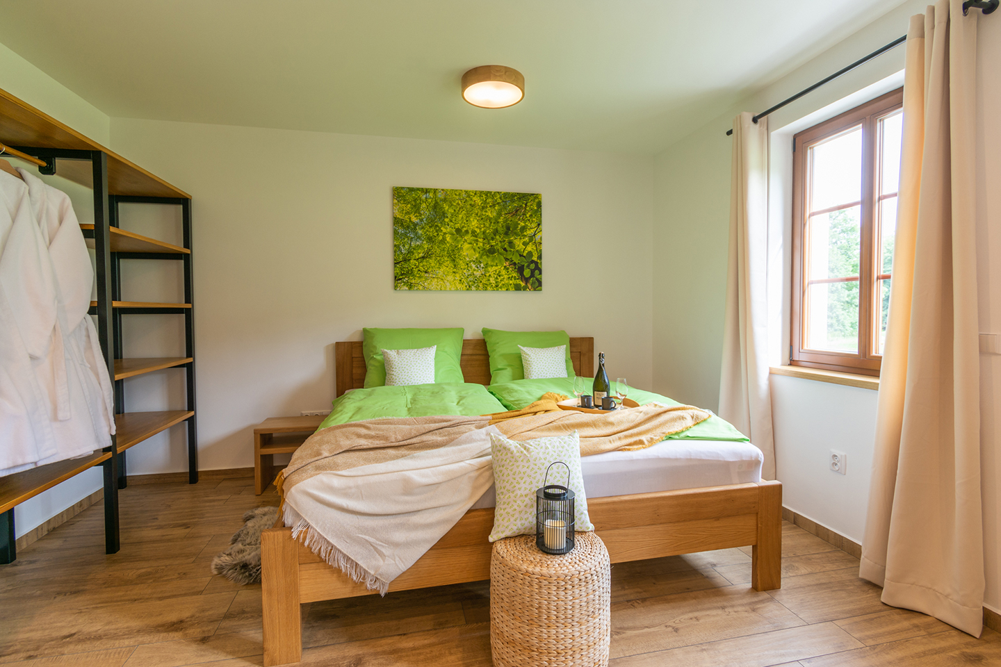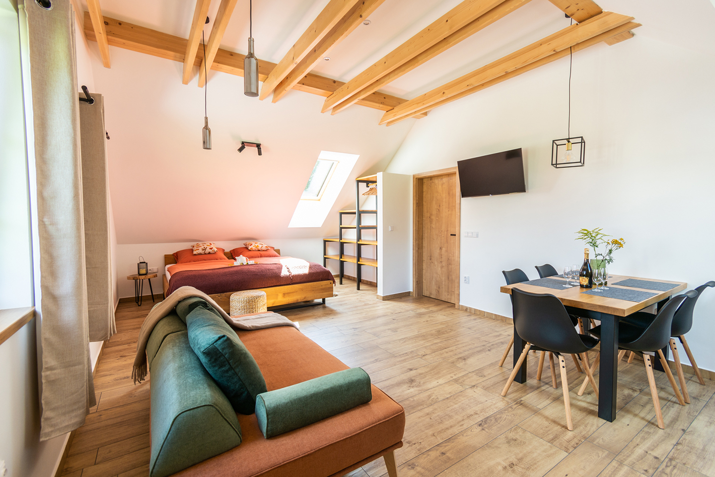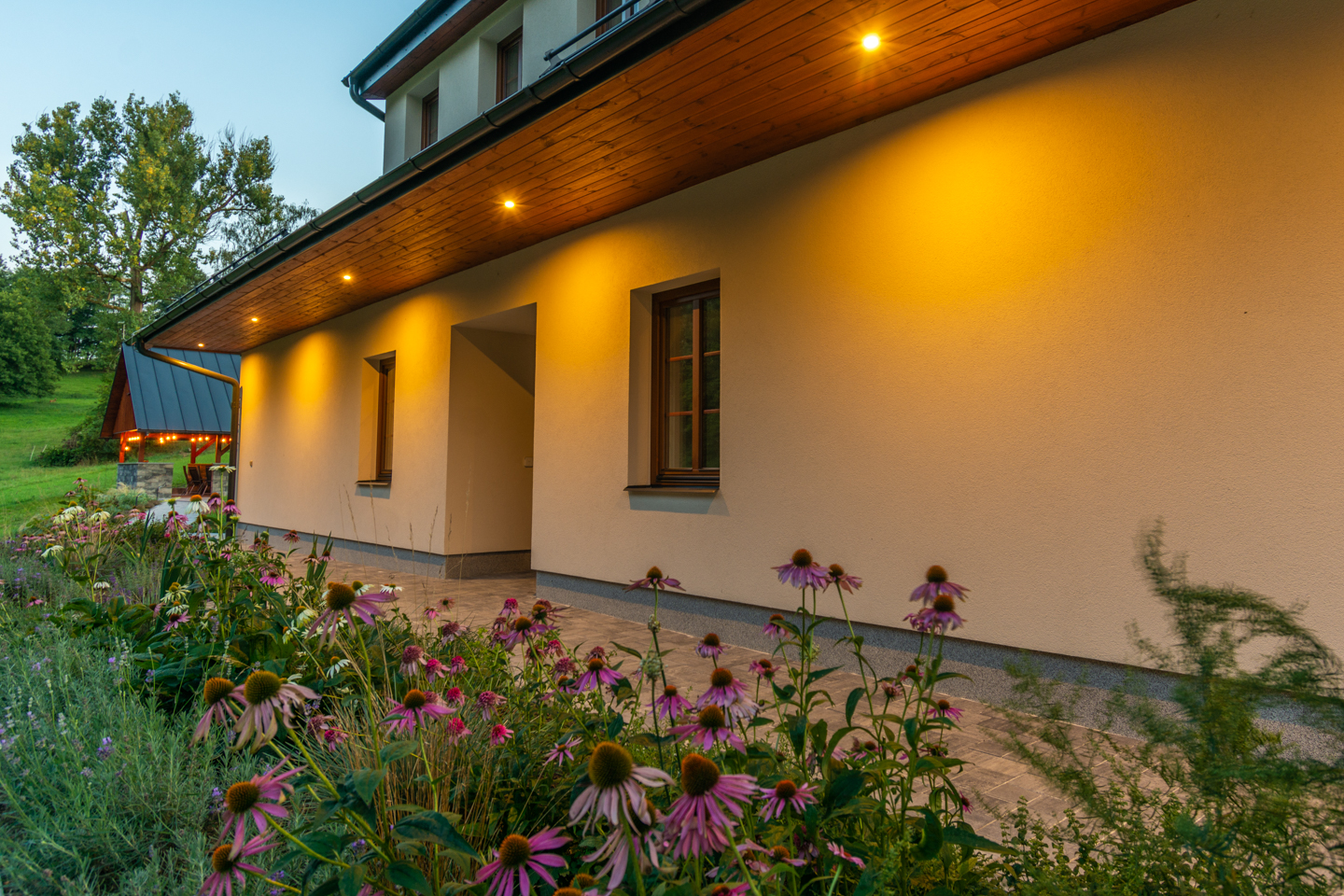 Tři stylové wellness apartmány pro 2–15 osob s privátní vířivkou, moderním nábytkem, plně vybavenou kuchyňkou, vlastním parkováním, Wi‑Fi a krásnou zahradou s posezením a venkovním ohništěm.