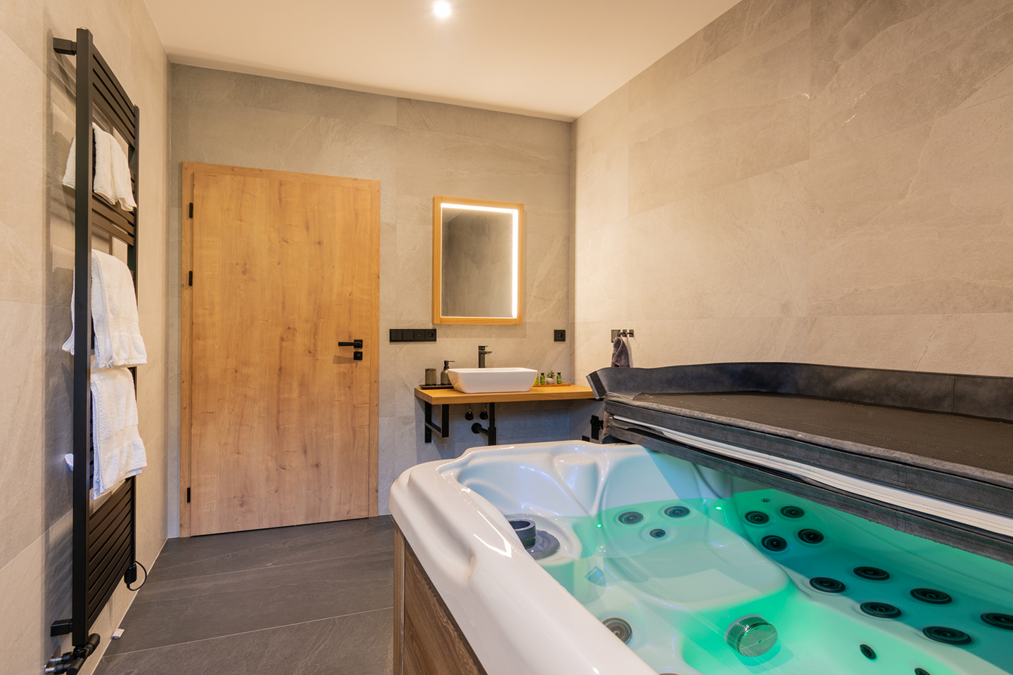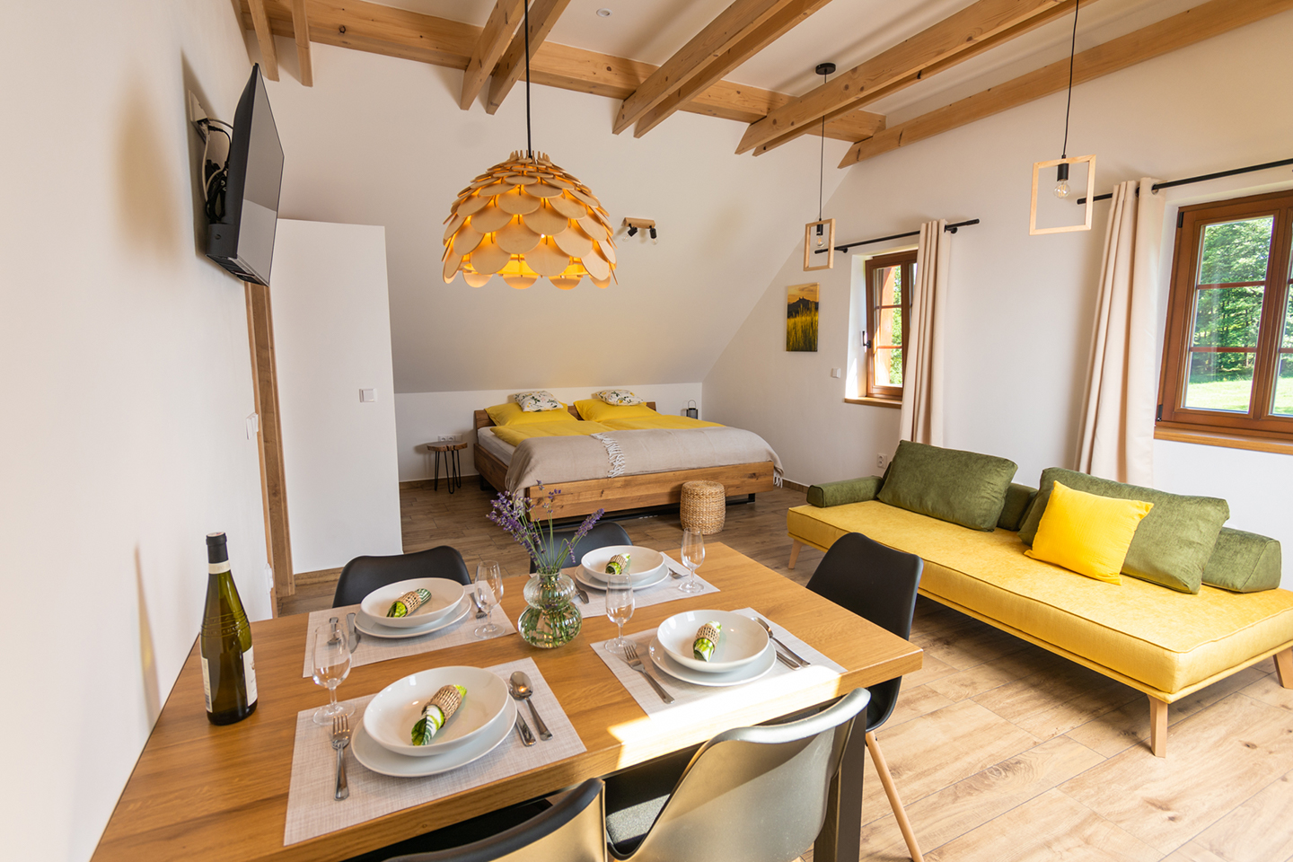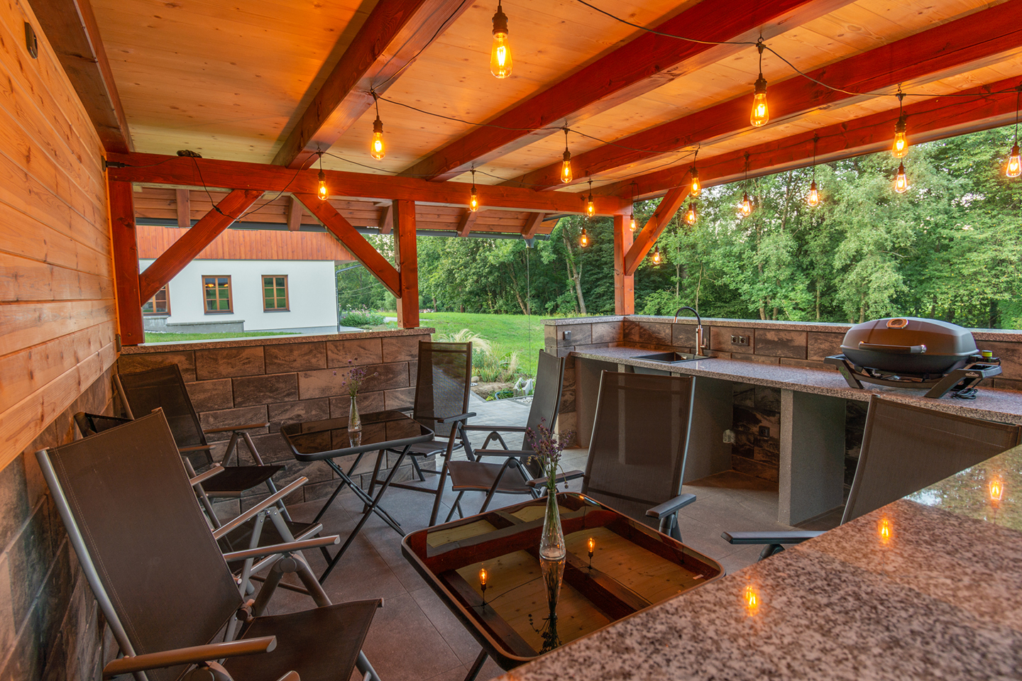 Tři stylové wellness apartmány pro 2–15 osob s privátní vířivkou, moderním nábytkem, plně vybavenou kuchyňkou, vlastním parkováním, Wi‑Fi a krásnou zahradou s posezením a venkovním ohništěm.