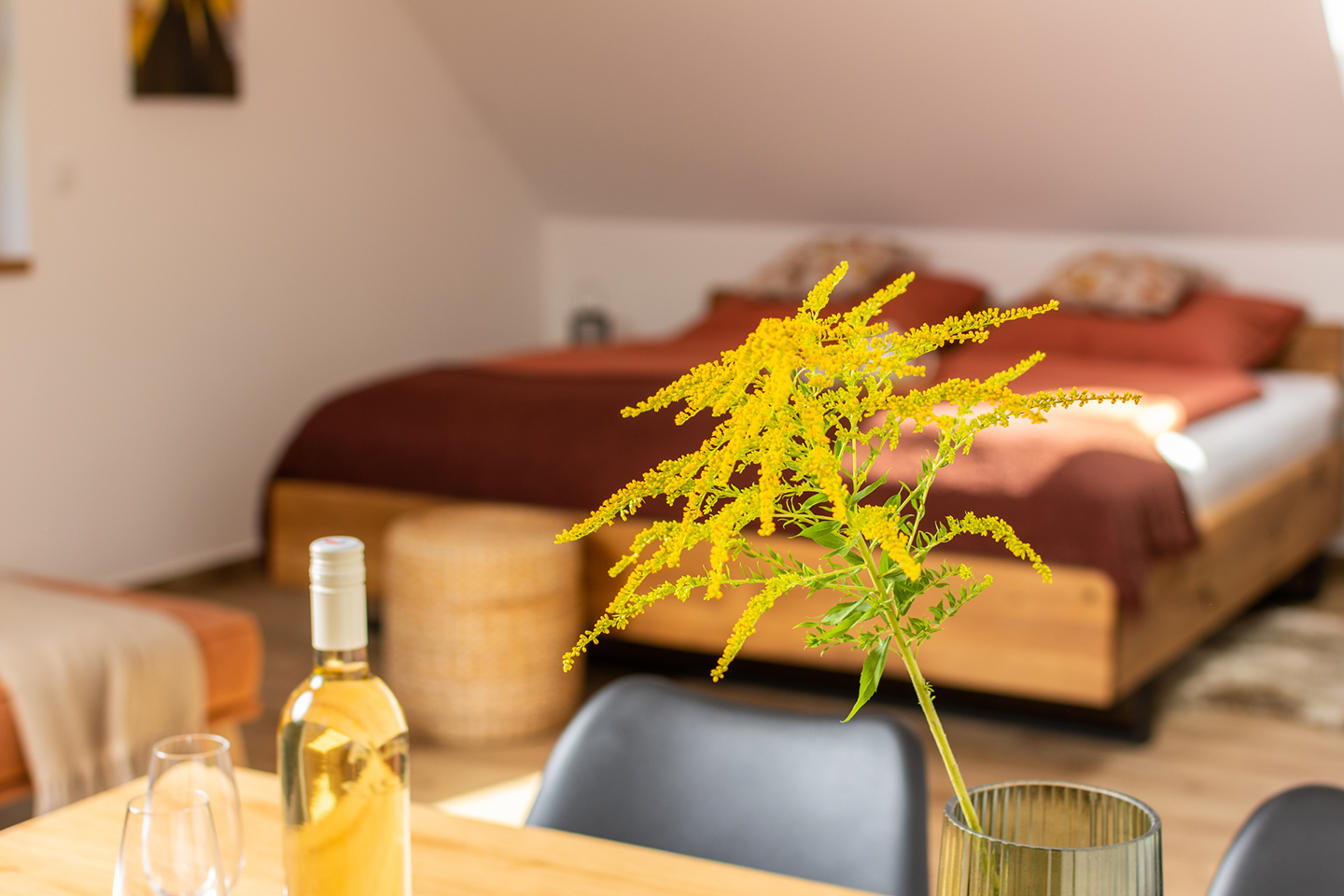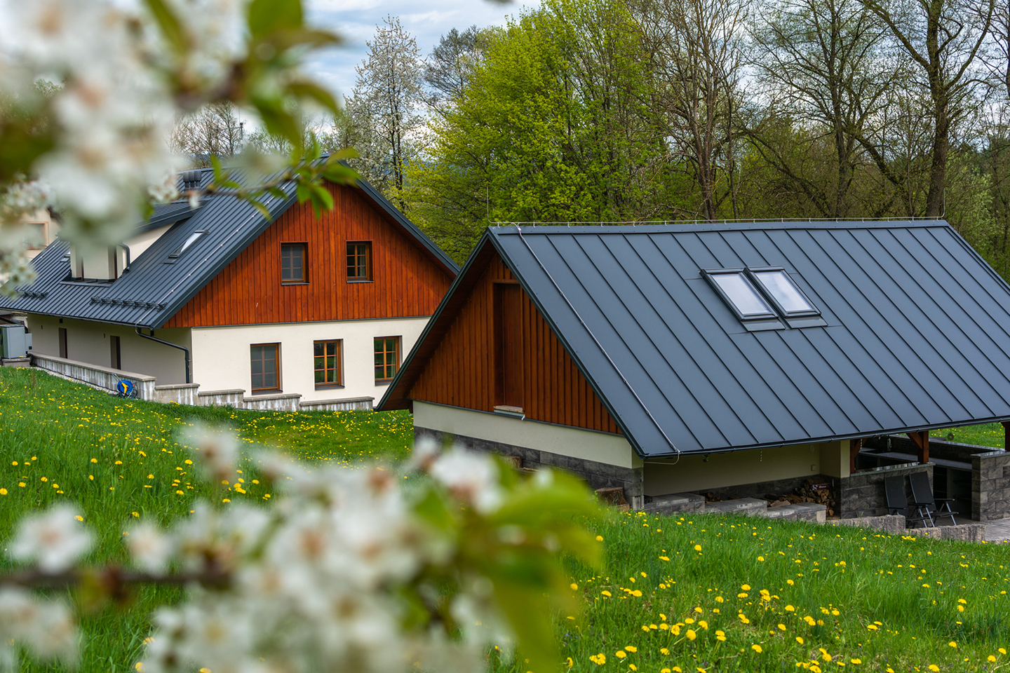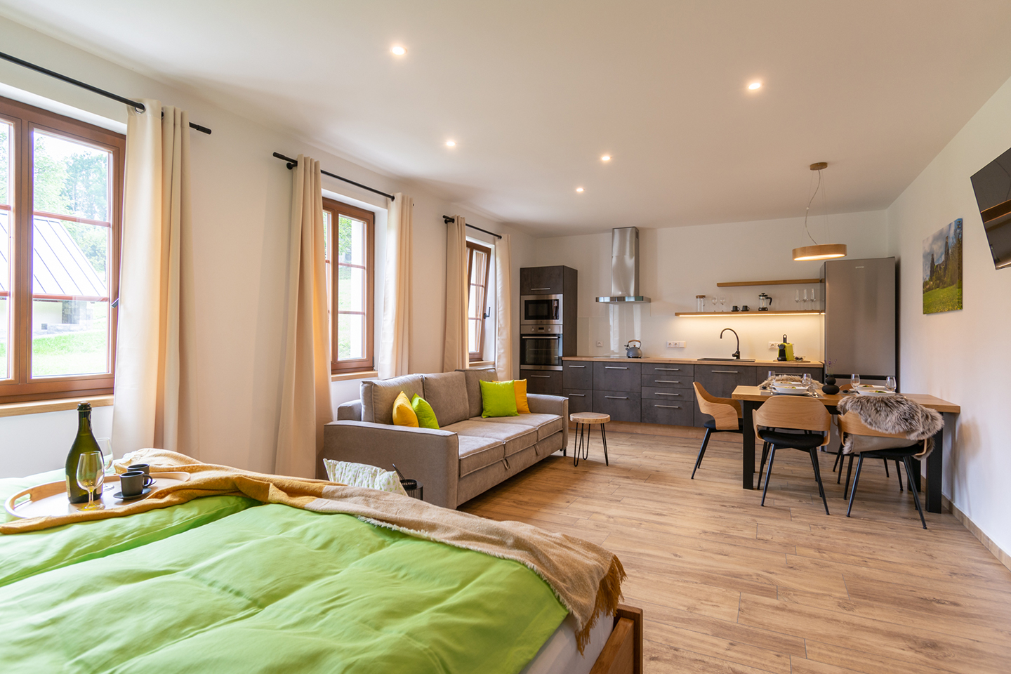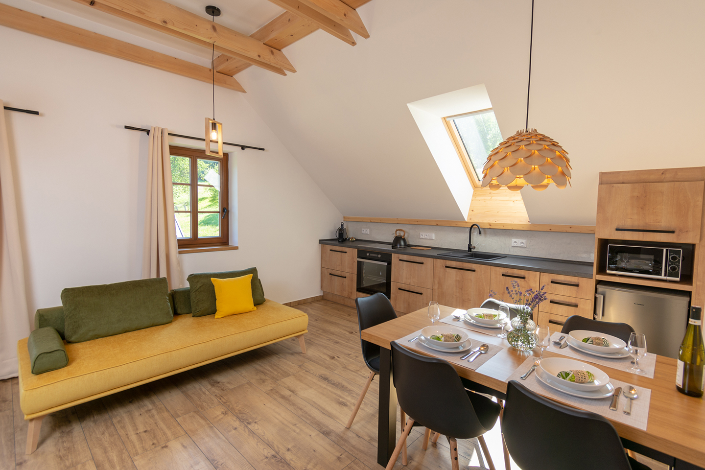 Tři stylové wellness apartmány pro 2–15 osob s privátní vířivkou, moderním nábytkem, plně vybavenou kuchyňkou, vlastním parkováním, Wi‑Fi a krásnou zahradou s posezením a venkovním ohništěm.