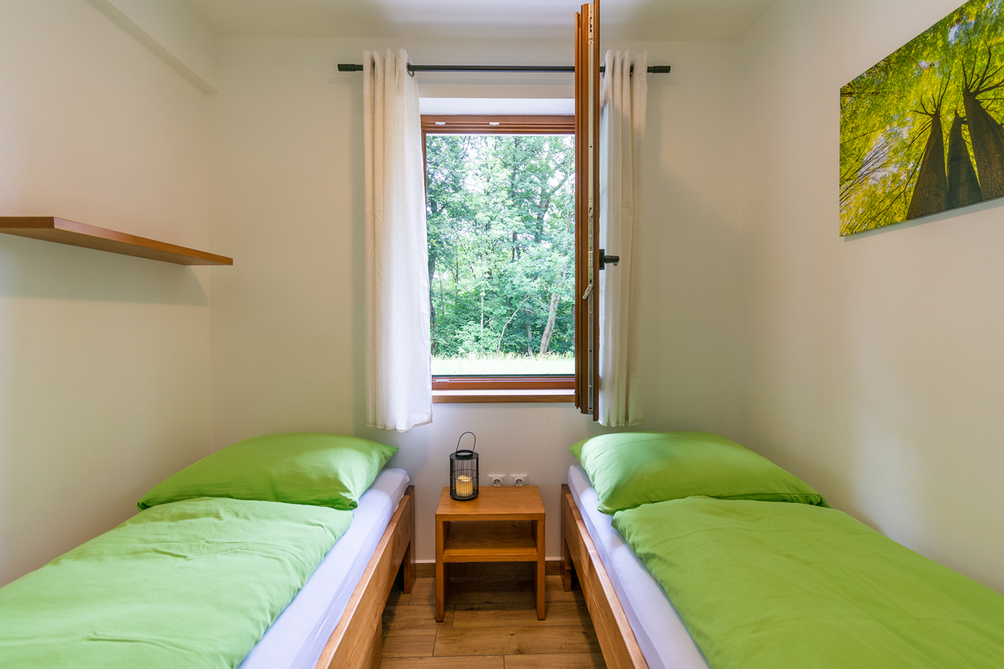 - 2x jednolůžko v samostatné ložnici, 1x přistýlka na pohovce v obývací části