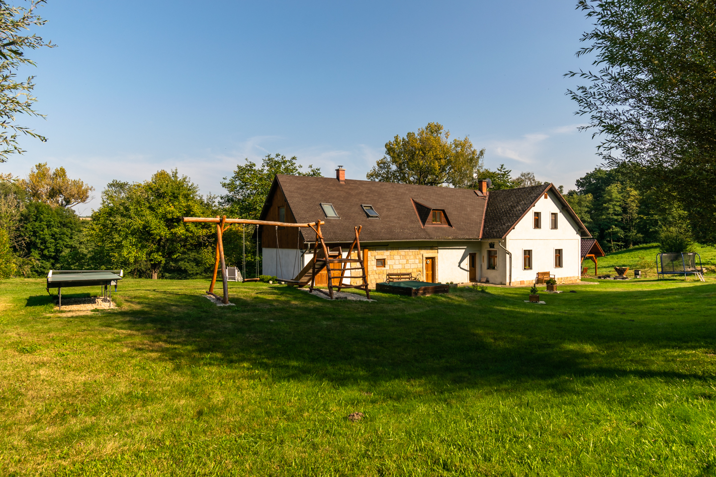 Děti u nás mají spoustu možností, jak se aktivně zabavit. Pro nejmenší je uvnitř v chalupě k dispozici malý dětský stoleček se židličkami, kde si děti mohou hrát pod vaším dohledem. Venkovní prostory nabízejí možnost zařádit si na pískovišti, na prolézačkách nebo si zaskákat na trampolíně, v létě jistě přijde vhod ochlazení v bazénu.
