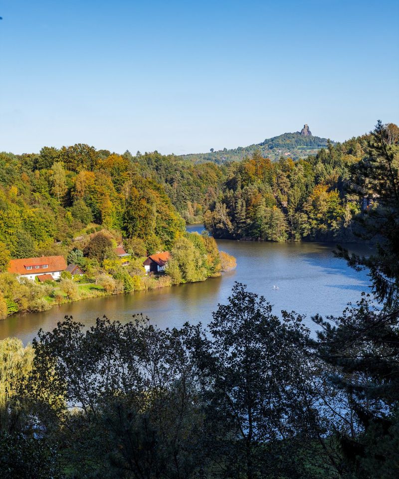 Der Věžický-Teich befindet sich im Herzen des Böhmischen Paradieses. Von dort aus können Sie auf markierten Wander- und Radwegen nach Trosky, in die Felsenstadt Hrubá Skála, zum Pekařova-Tor oder zur Burg Kost fahren.