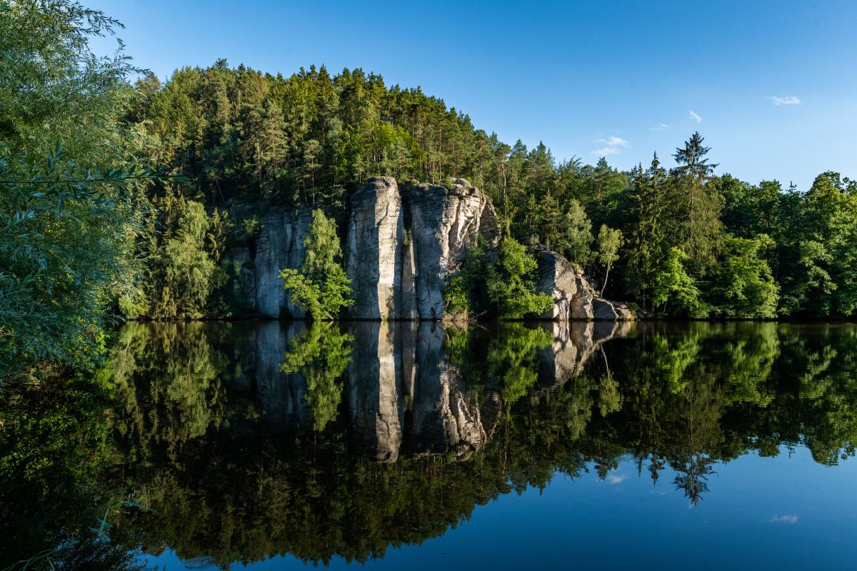 The Bohemian Paradise is characterised by its rock towns, which can be found in numerous places around the region. However, the rocks meet water in only a few of them. One of these places, probably the most beautiful, is Věžický pond also known as Věžák, as it has rocks rising straight up from the water. The most popular rock at Věžák is the Water Rock on its south-western bank, the top of which can be reached via the climbing route from the water or on foot from the other side.